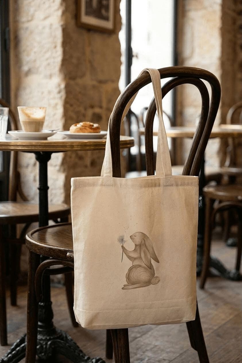 Imprimeu: Vizualul este realizat de Bianca Anton, ilustrator care a dat naștere brandului Maruki ART, un brand 100% românesc, menit să aducă mai mult ludic în viața noastră. Grafica cu iepurașul este imprimată prin transfer termic pe sacoșele noastre.